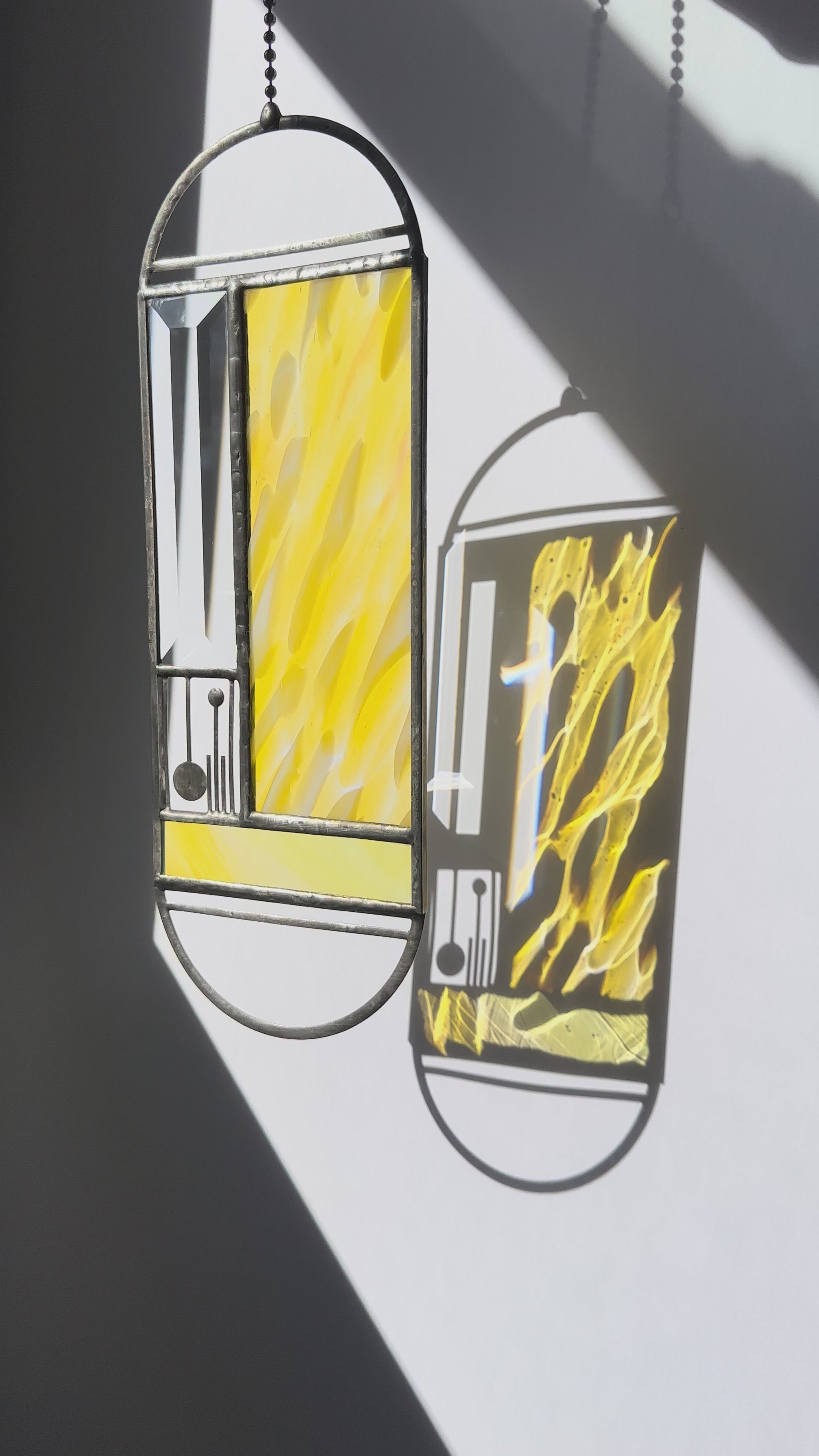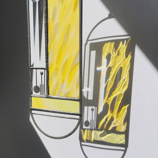 Large Sunset Meridian Suncatcher in transparent rainbow glass. This design features mouth blown panels of glass made by glassblowers at Fremont Antique Glass in Seattle, Washington. Each panel takes several days to produce and is entirely one of a kind. Due to the handmade nature of this glass, you may notice air bubbles, lines, or scratches.