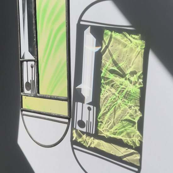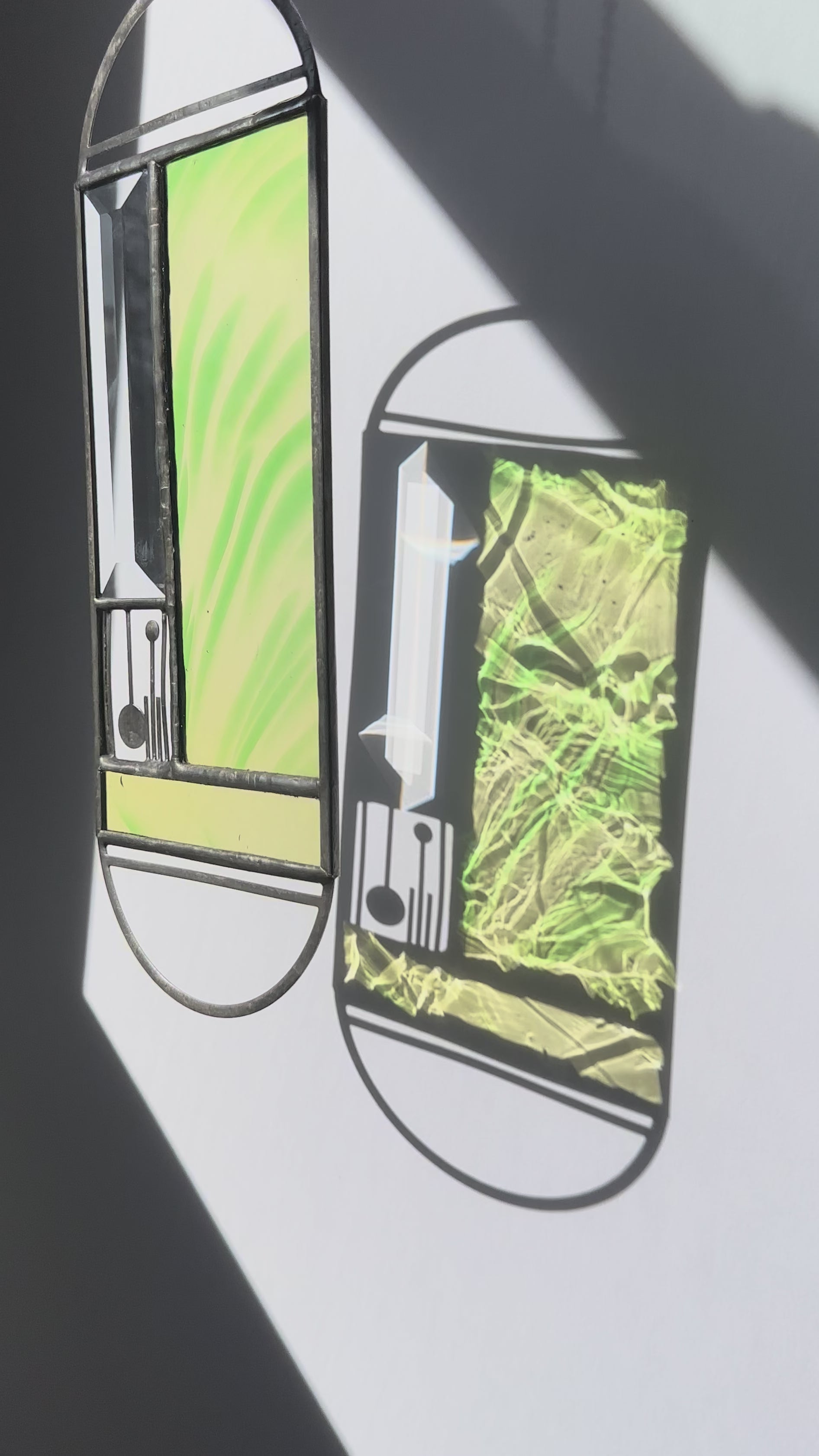 Large Sunset Meridian Suncatcher in transparent rainbow glass. This design features mouth blown panels of glass made by glassblowers at Fremont Antique Glass in Seattle, Washington. Each panel takes several days to produce and is entirely one of a kind. Due to the handmade nature of this glass, you may notice air bubbles, lines, or scratches.