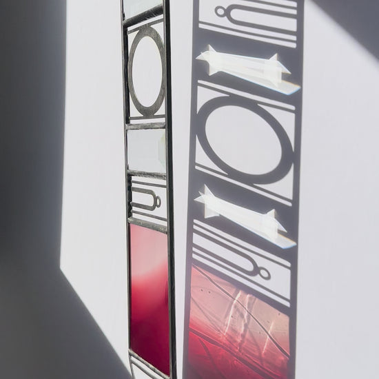 Large Sunset Reflection Suncatcher in transparent rainbow glass. This design features mouth blown panels of glass made by glassblowers at Fremont Antique Glass in Seattle, Washington. Each panel takes several days to produce and is entirely one of a kind. Due to the handmade nature of this glass, you may notice air bubbles, lines, or scratches.
