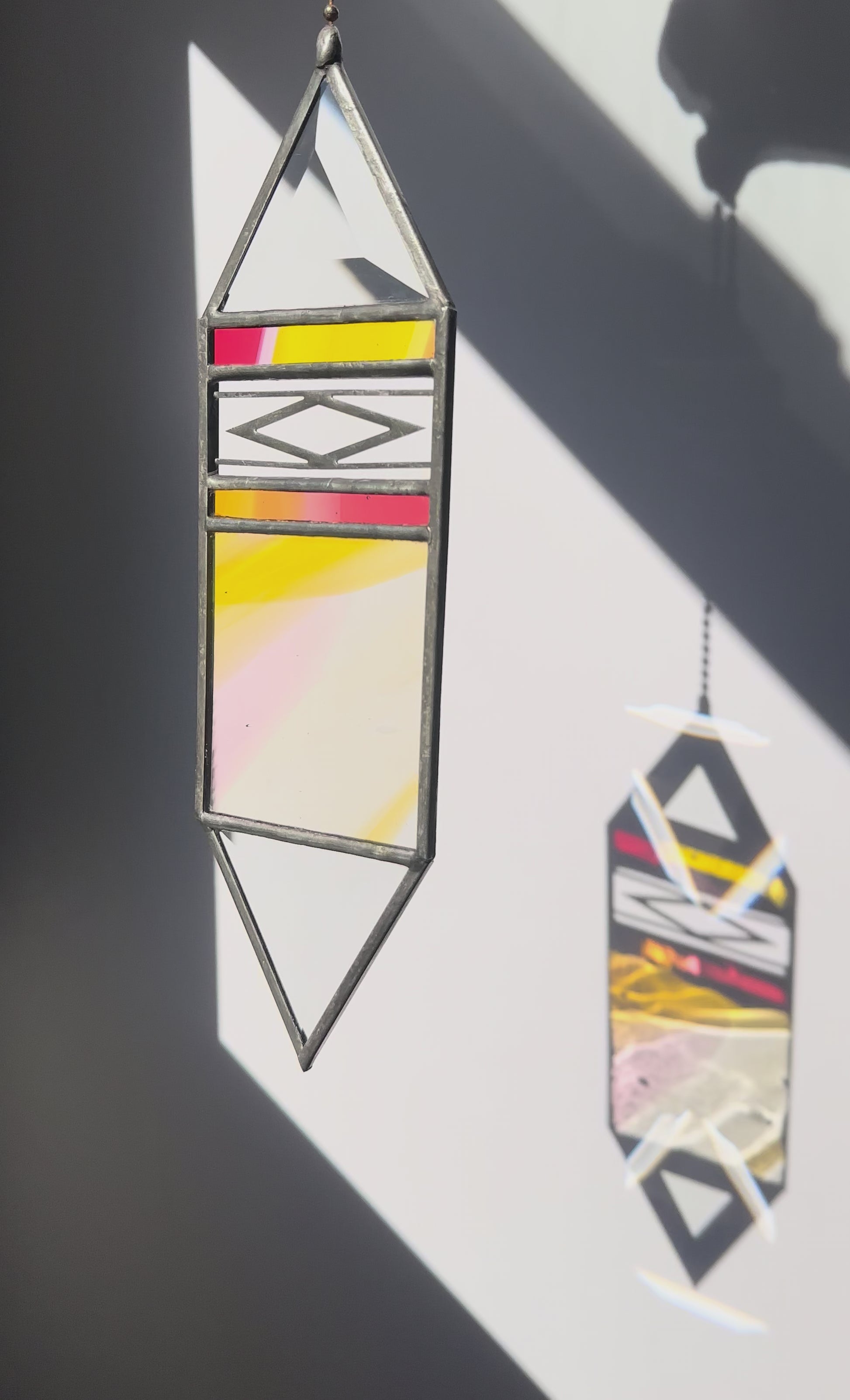 Large Sunset Trigon Suncatcher in transparent rainbow glass. This design features mouth blown panels of glass made by glassblowers at Fremont Antique Glass in Seattle, Washington. Each panel takes several days to produce and is entirely one of a kind. Due to the handmade nature of this glass, you may notice air bubbles, lines, or scratches.