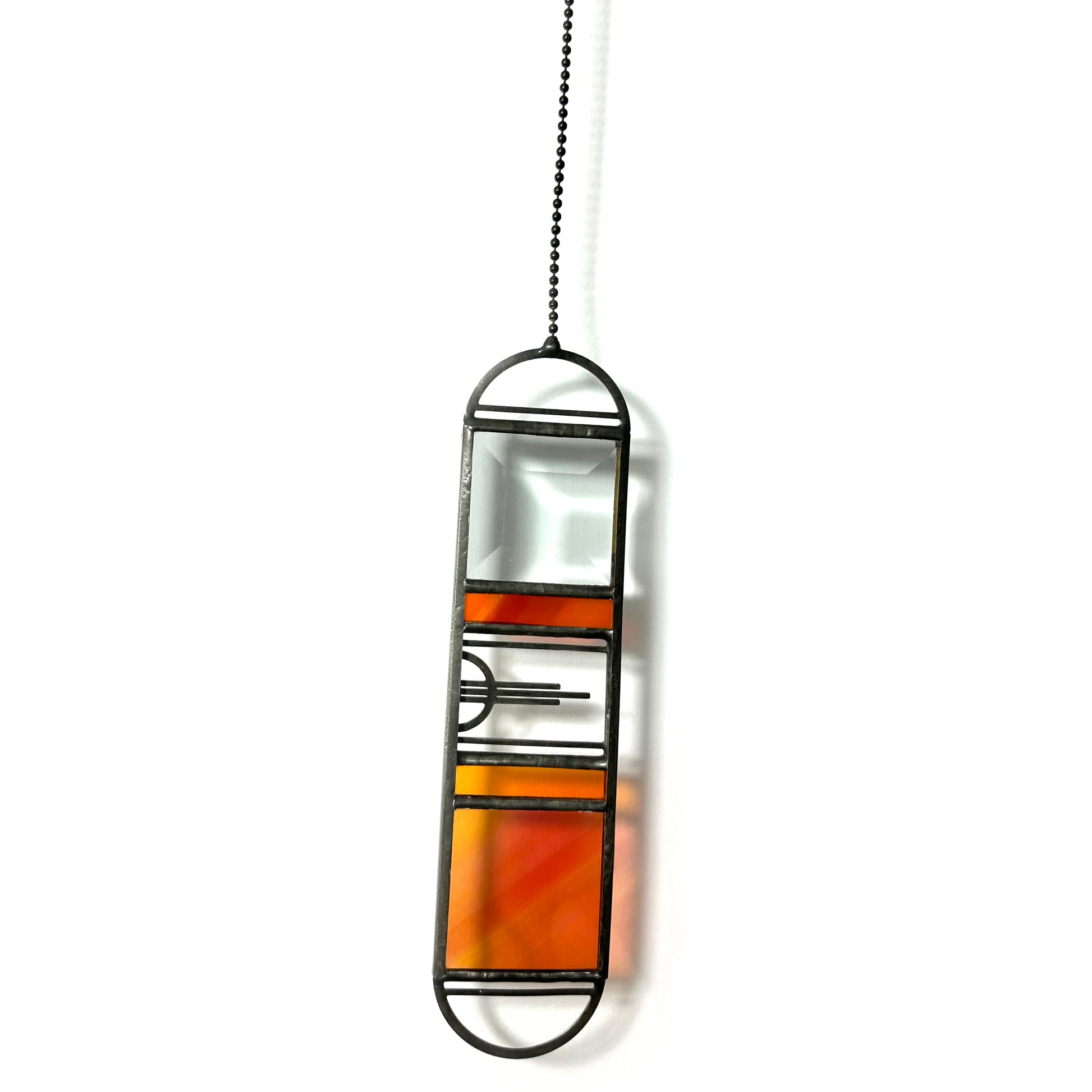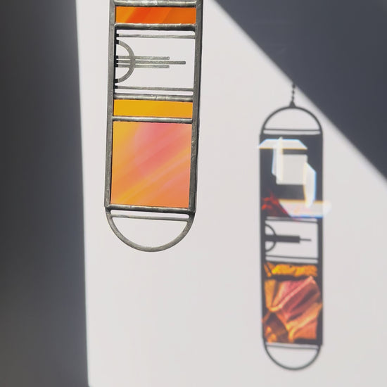Small Sunset Sunburst Suncatcher in transparent rainbow glass. This design features mouth blown panels of glass made by glassblowers at Fremont Antique Glass in Seattle, Washington. Each panel takes several days to produce and is entirely one of a kind. Due to the handmade nature of this glass, you may notice air bubbles, lines, or scratches.