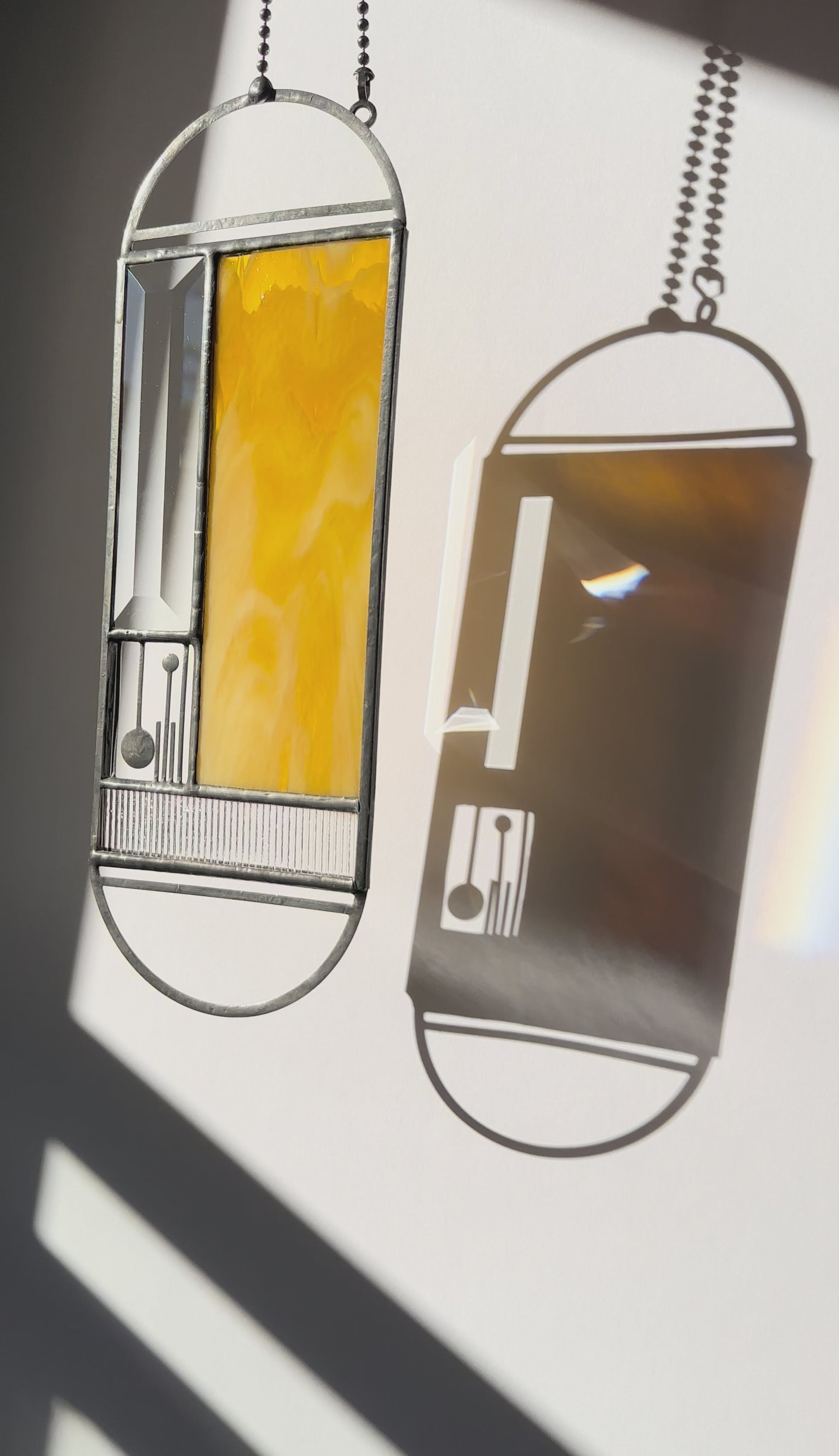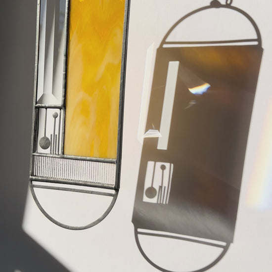 Amber marbled glass Meridian Suncatcher. Features a handmade panel of amber and white glass with a unique swirled pattern.