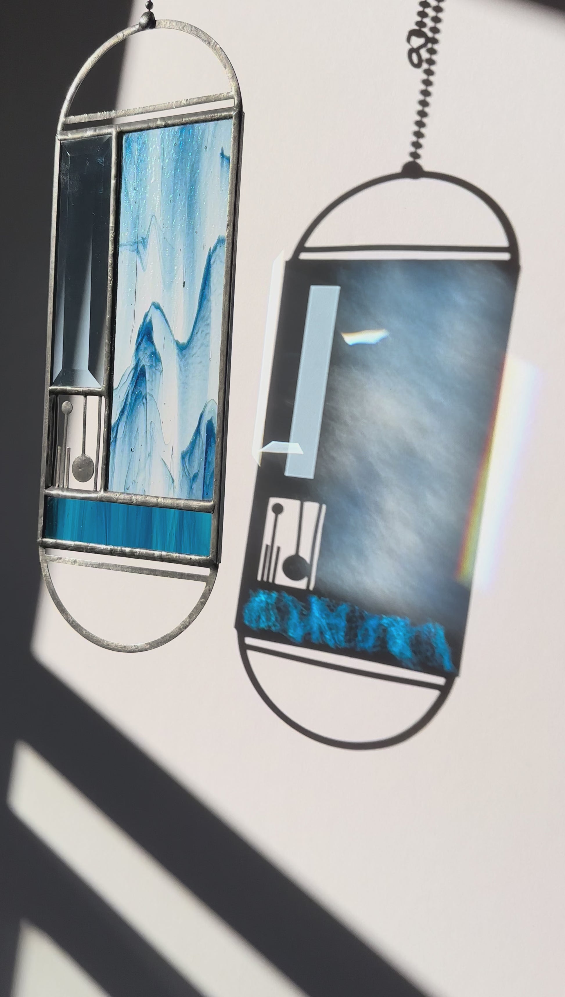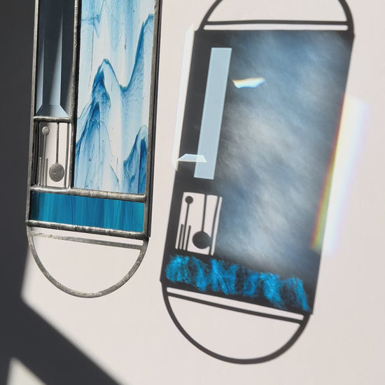 Blue aventurine marbled glass Meridian Suncatcher. Features a handmade panel of blue aventurine and clear glass with a unique swirled pattern.