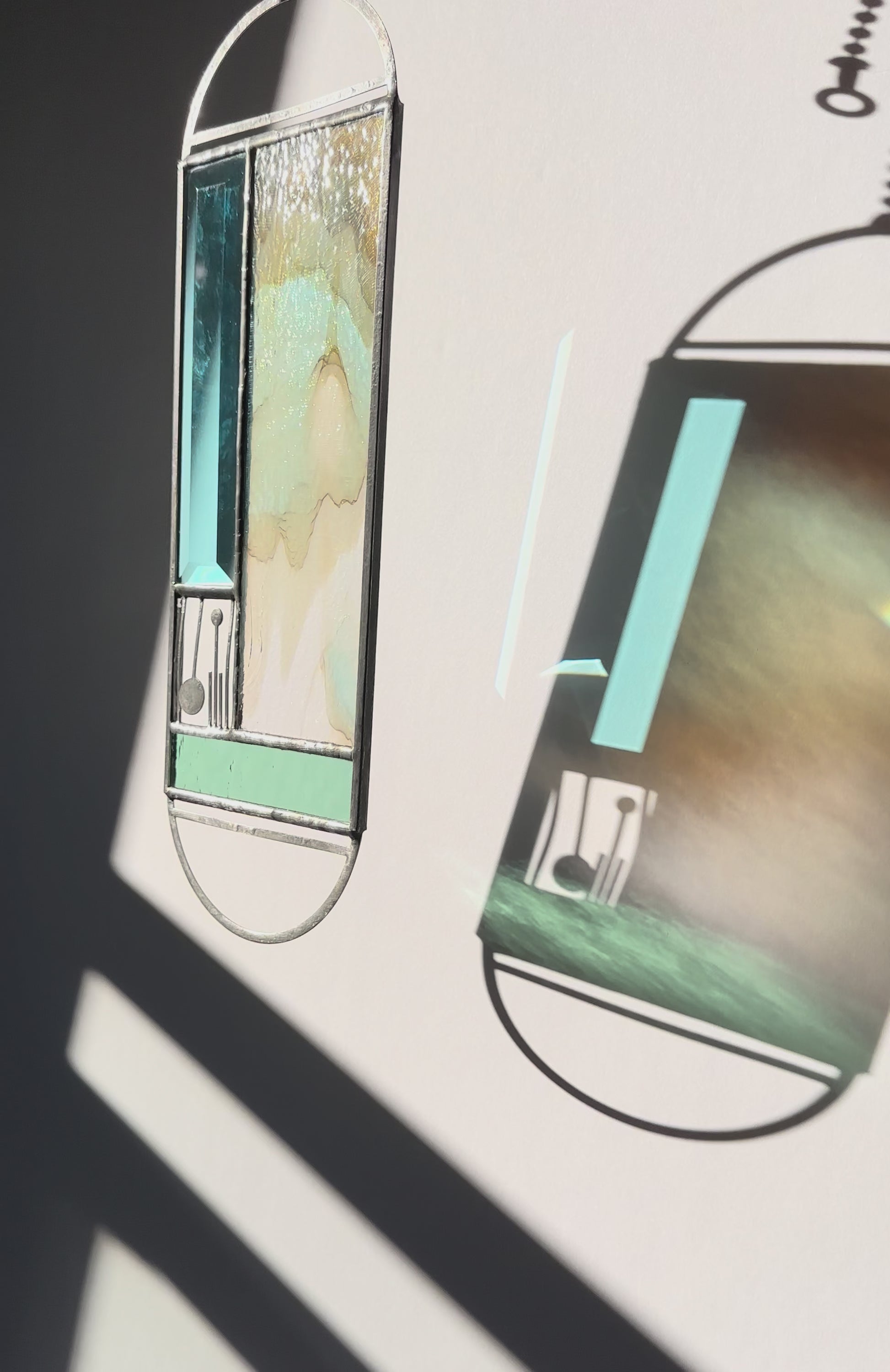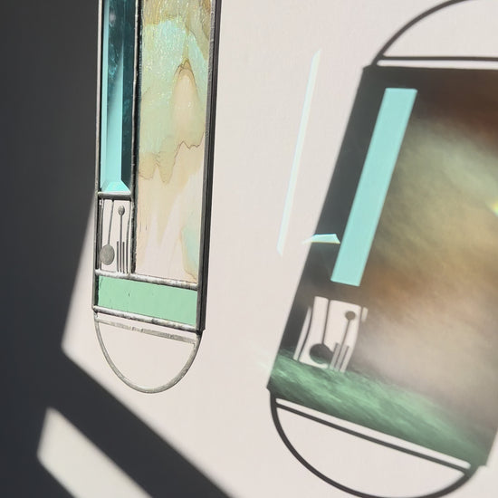 Sea foam and toffee marbled glass Meridian Suncatcher. Features a handmade panel of sea foam and toffee glass with a unique swirled pattern.