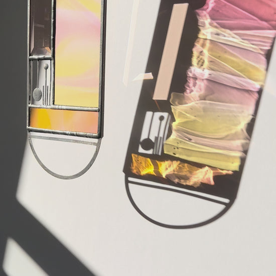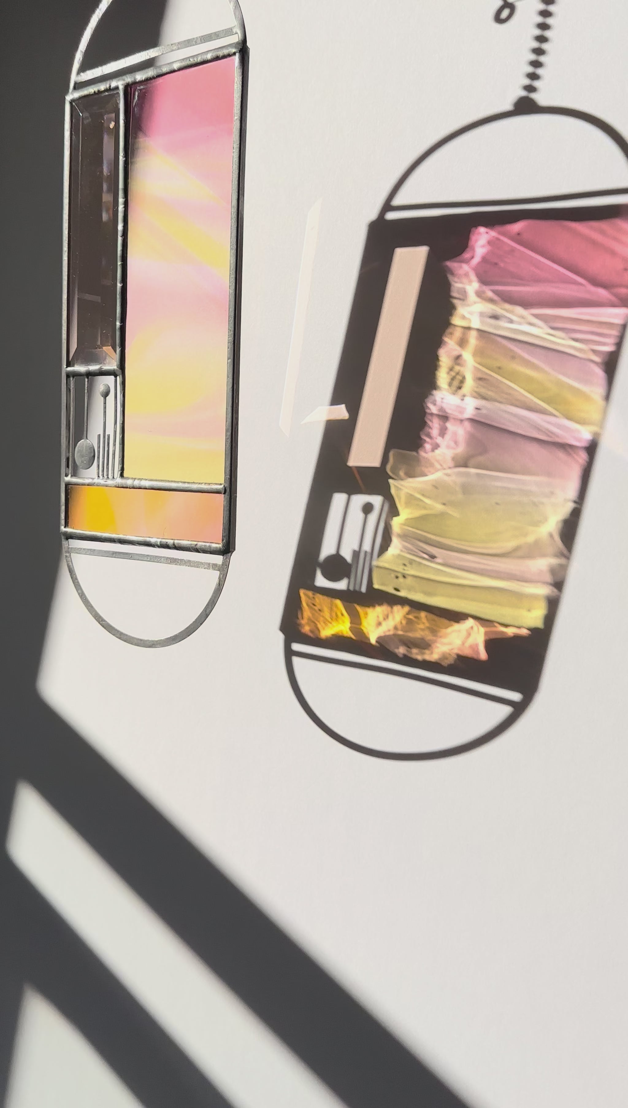 Large Sunset Meridian Suncatcher in transparent rainbow glass. This design features mouth blown panels of glass made by glassblowers at Fremont Antique Glass in Seattle, Washington. Each panel takes several days to produce and is entirely one of a kind. Due to the handmade nature of this glass, you may notice air bubbles, lines, or scratches.