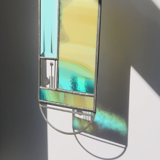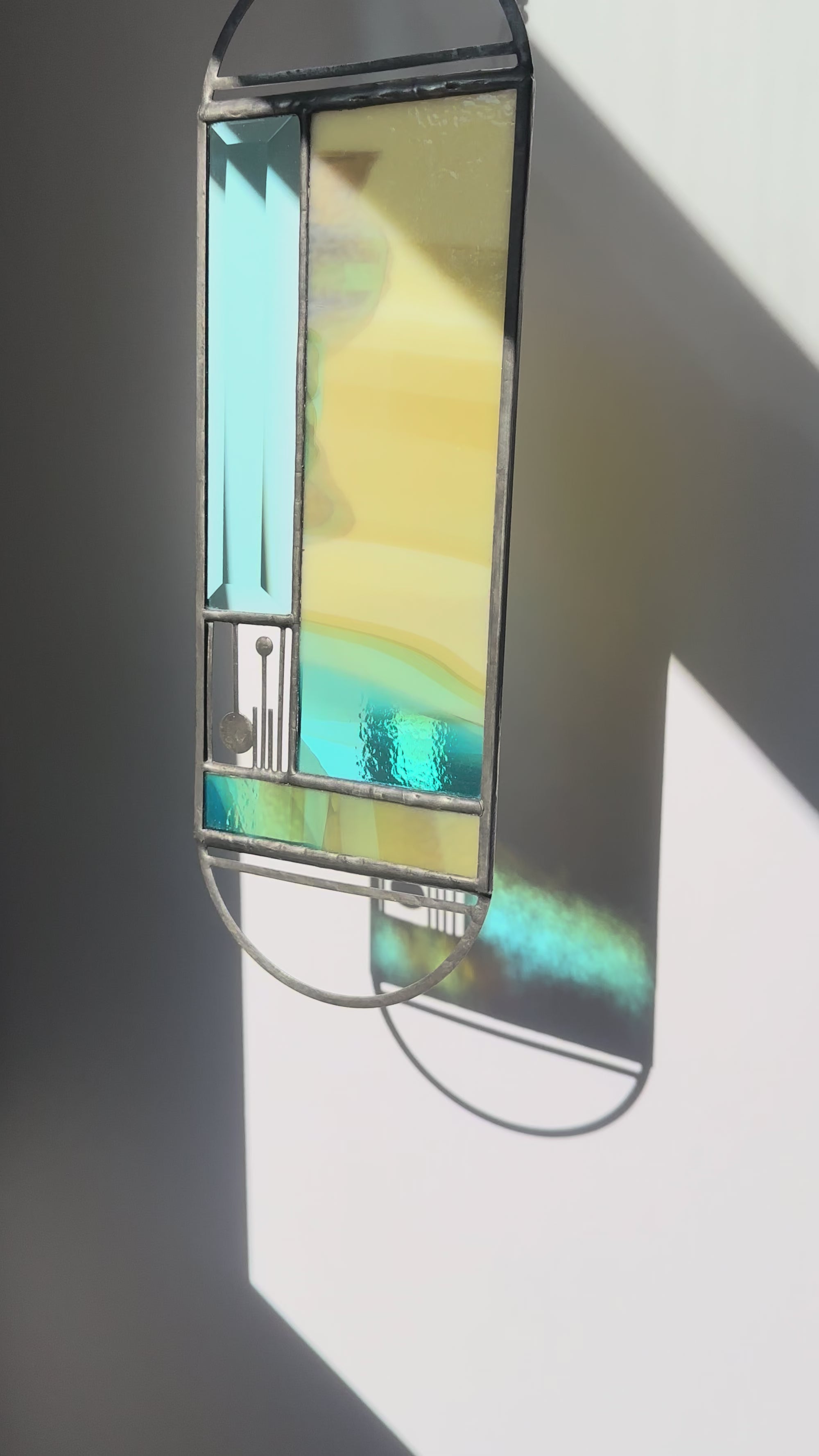 Turquoise and french vanilla marbled glass Meridian Suncatcher. Features a handmade panel of turquoise and french vanilla glass with a unique swirled pattern.