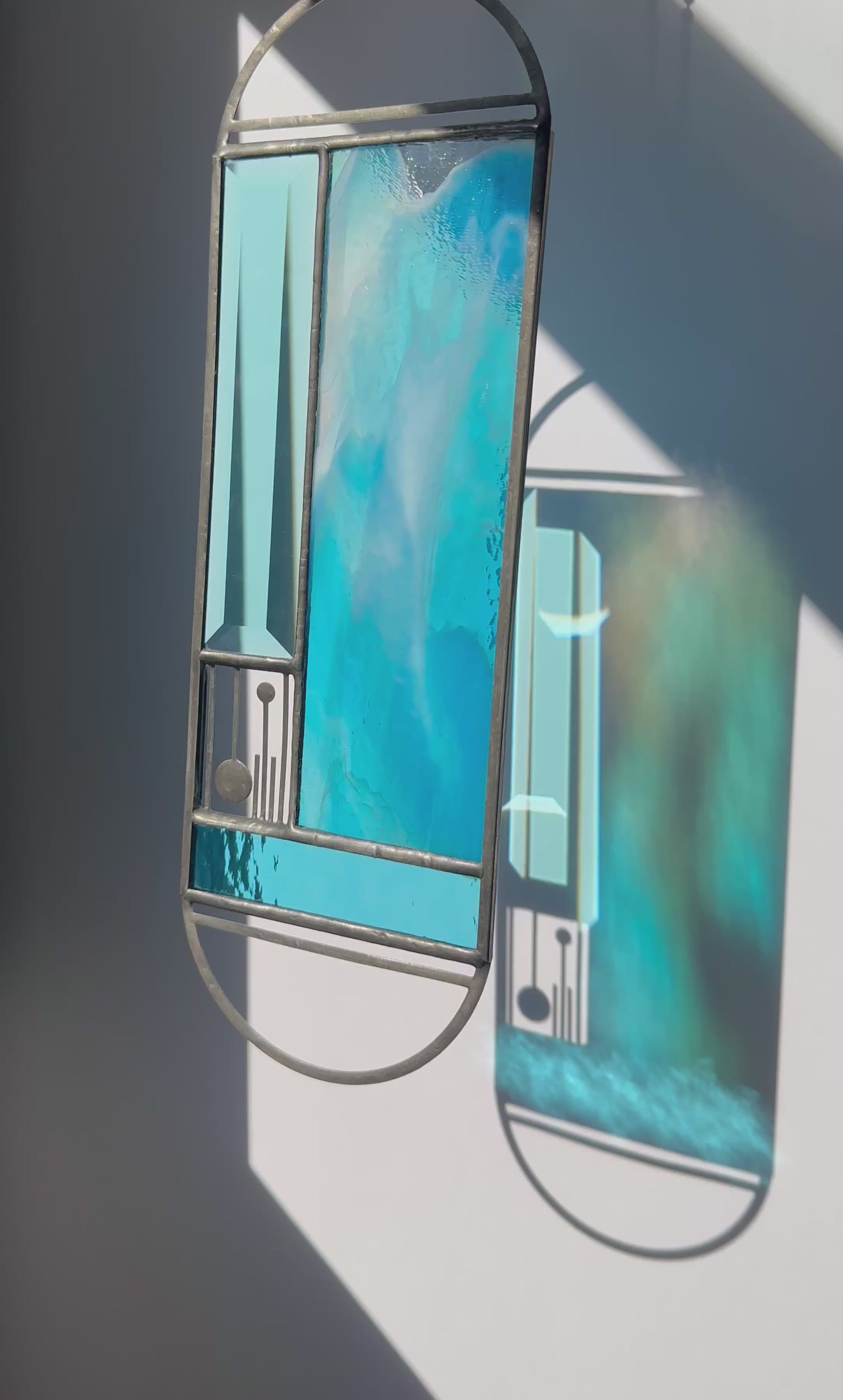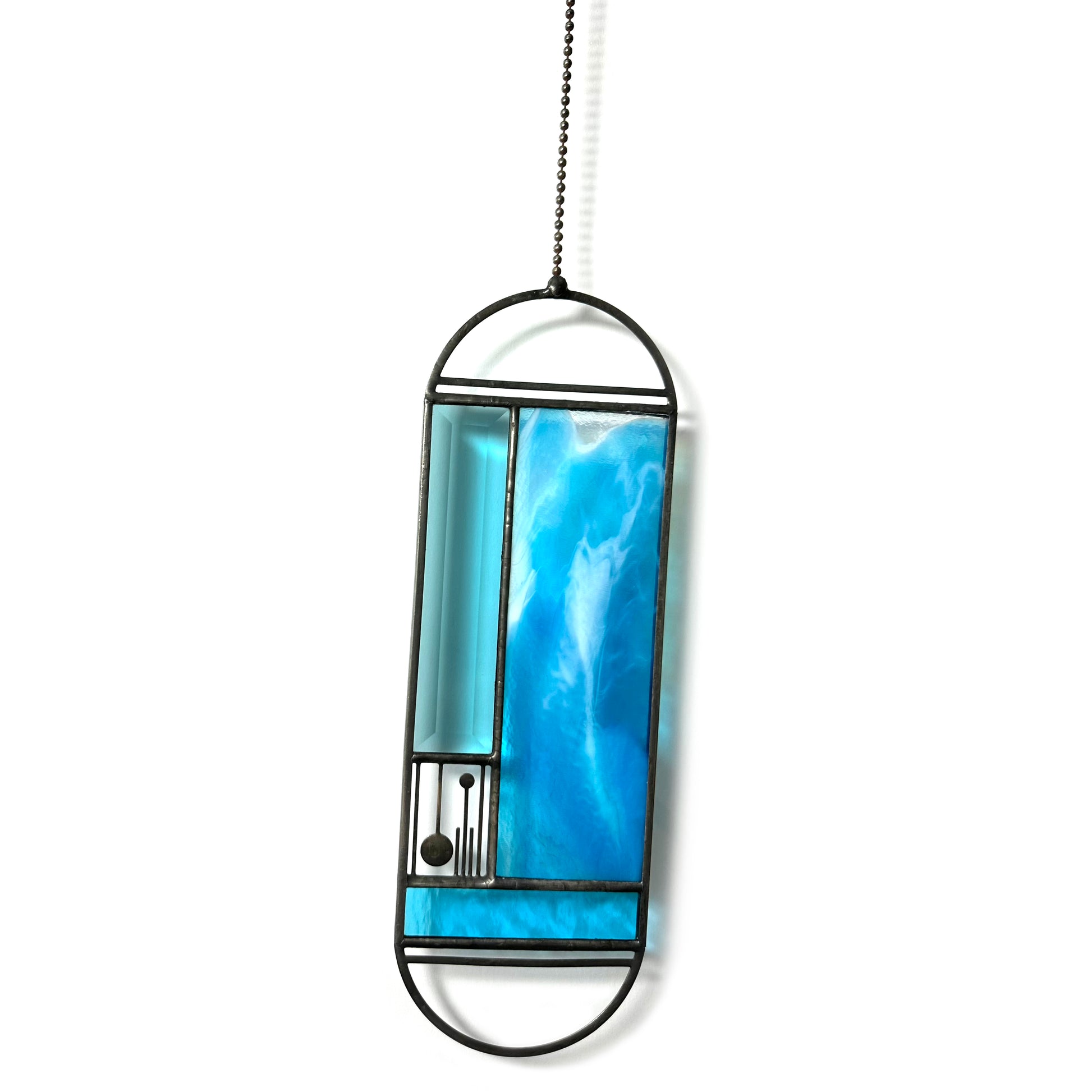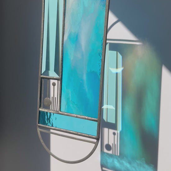 Turquoise Marbled glass Meridian Suncatcher. Features a handmade panel of turquoise and white glass with a unique swirled pattern.