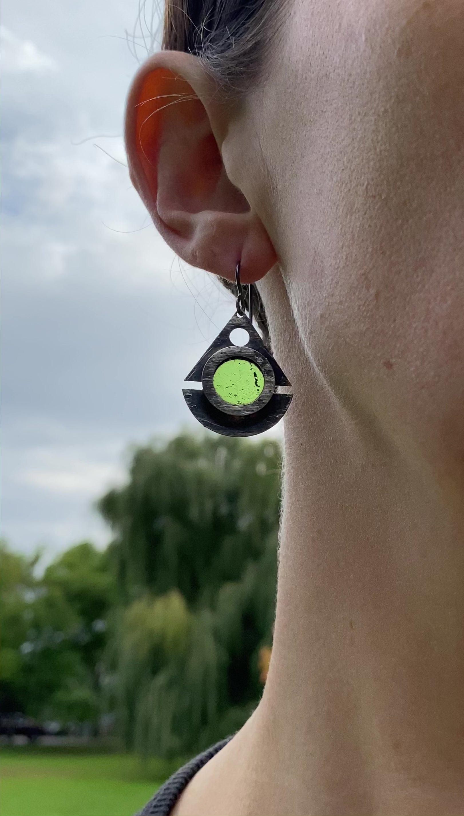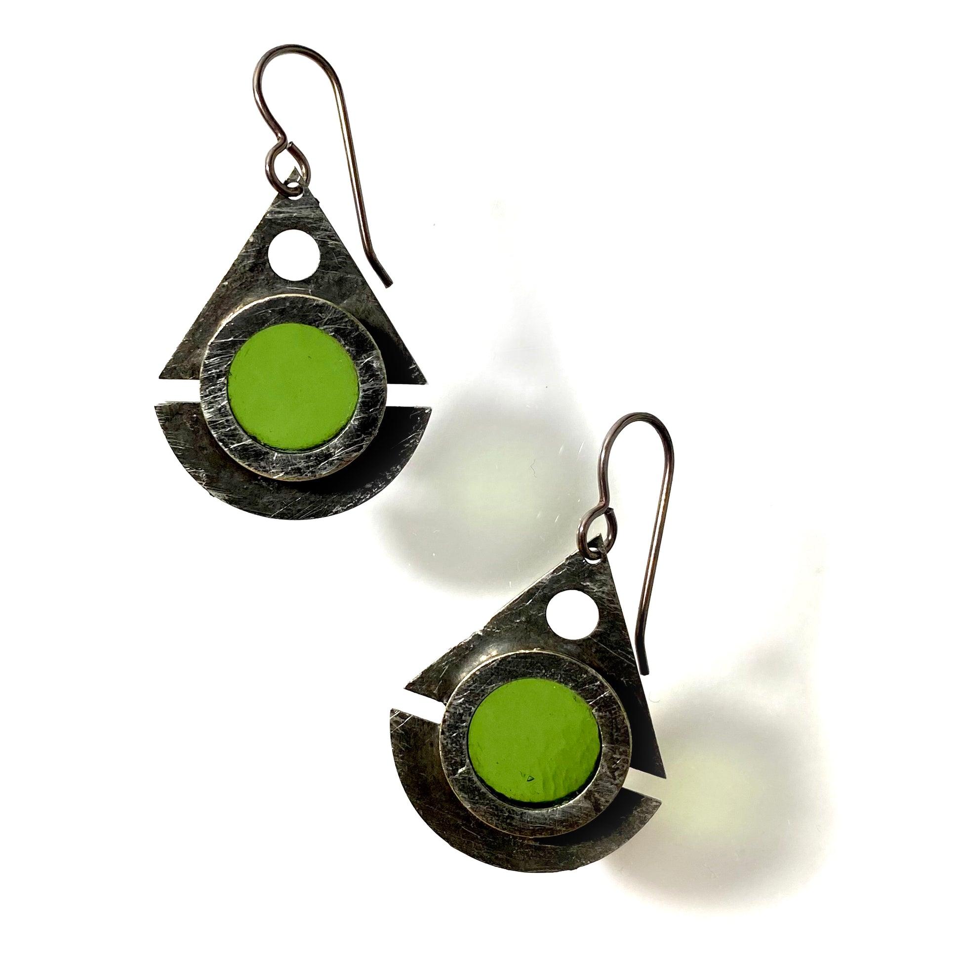 Seafarer Earrings in olive. Earrings are made from stained glass, silver, tin, and brass. Ear wires are oxidized sterling silver.