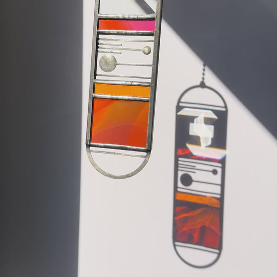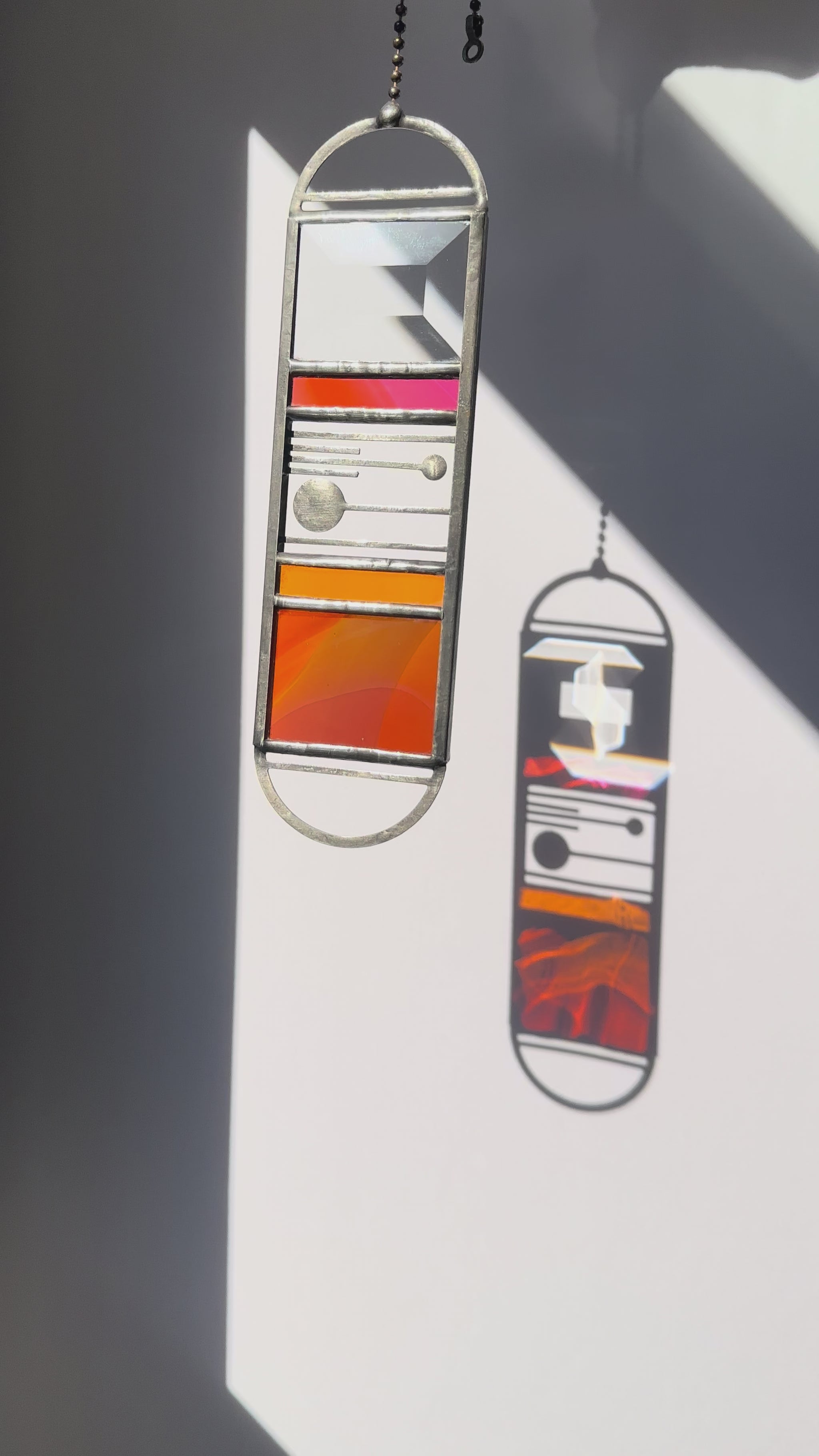 Small Sunset Meridian Suncatcher in transparent rainbow glass. This design features mouth blown panels of glass made by glassblowers at Fremont Antique Glass in Seattle, Washington. Each panel takes several days to produce and is entirely one of a kind. Due to the handmade nature of this glass, you may notice air bubbles, lines, or scratches.