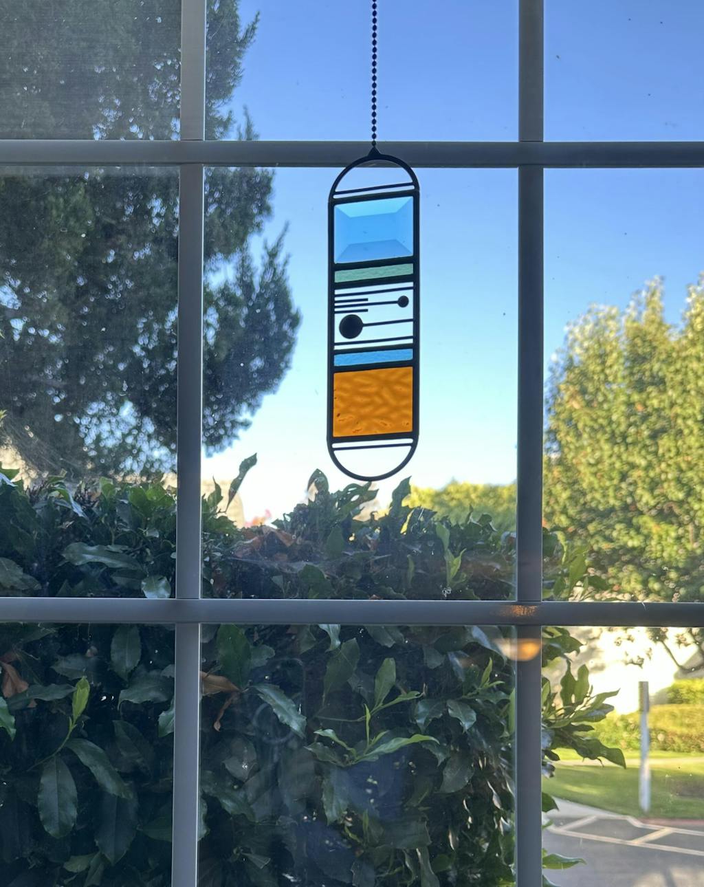 Small Meridian Suncatcher in turquoise, fern, sea blue, and amber. This design features a colored glass bevel (turquoise). Please note that the amber glass used in this design may have many surface lines (these are not cracks).