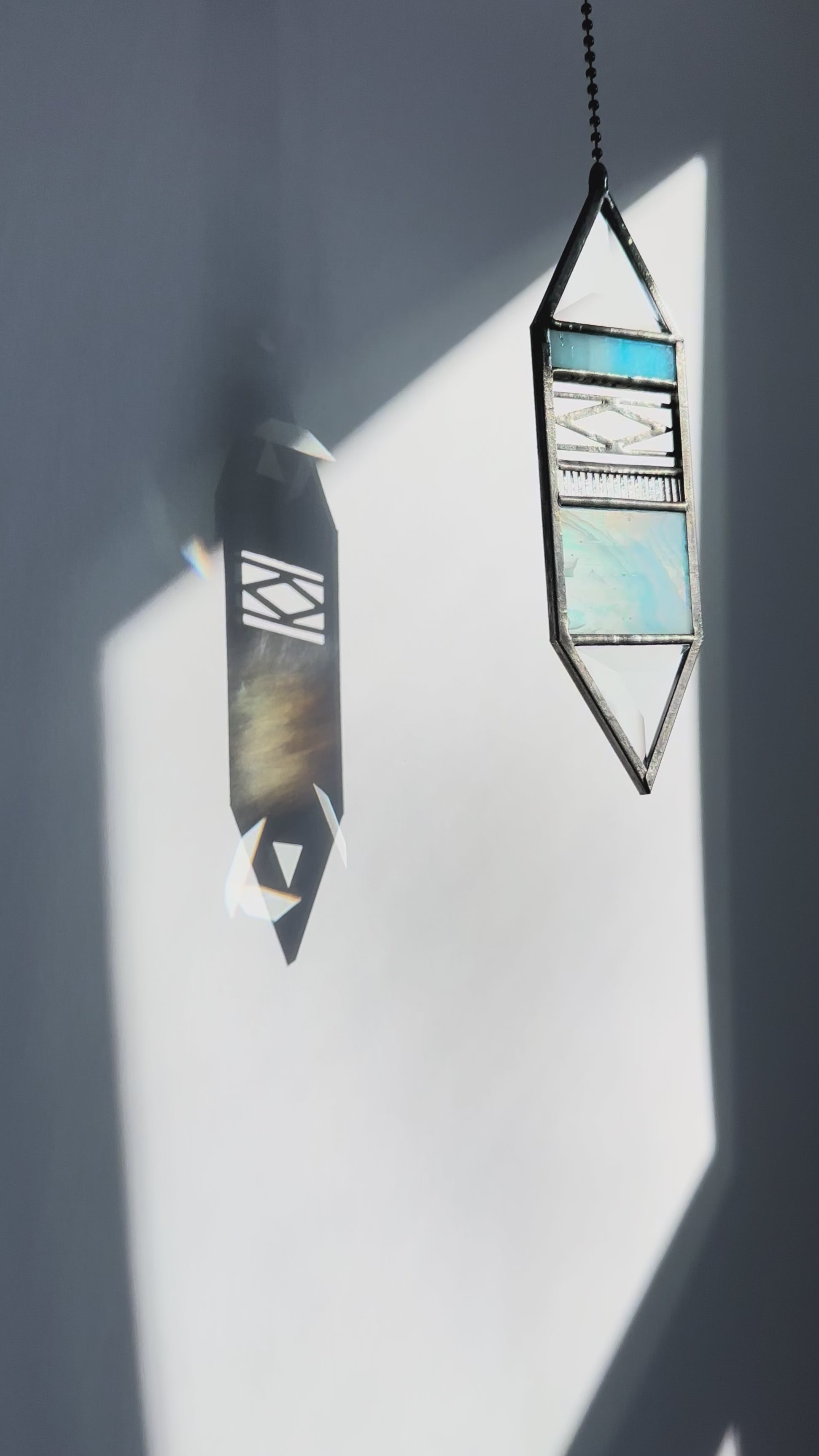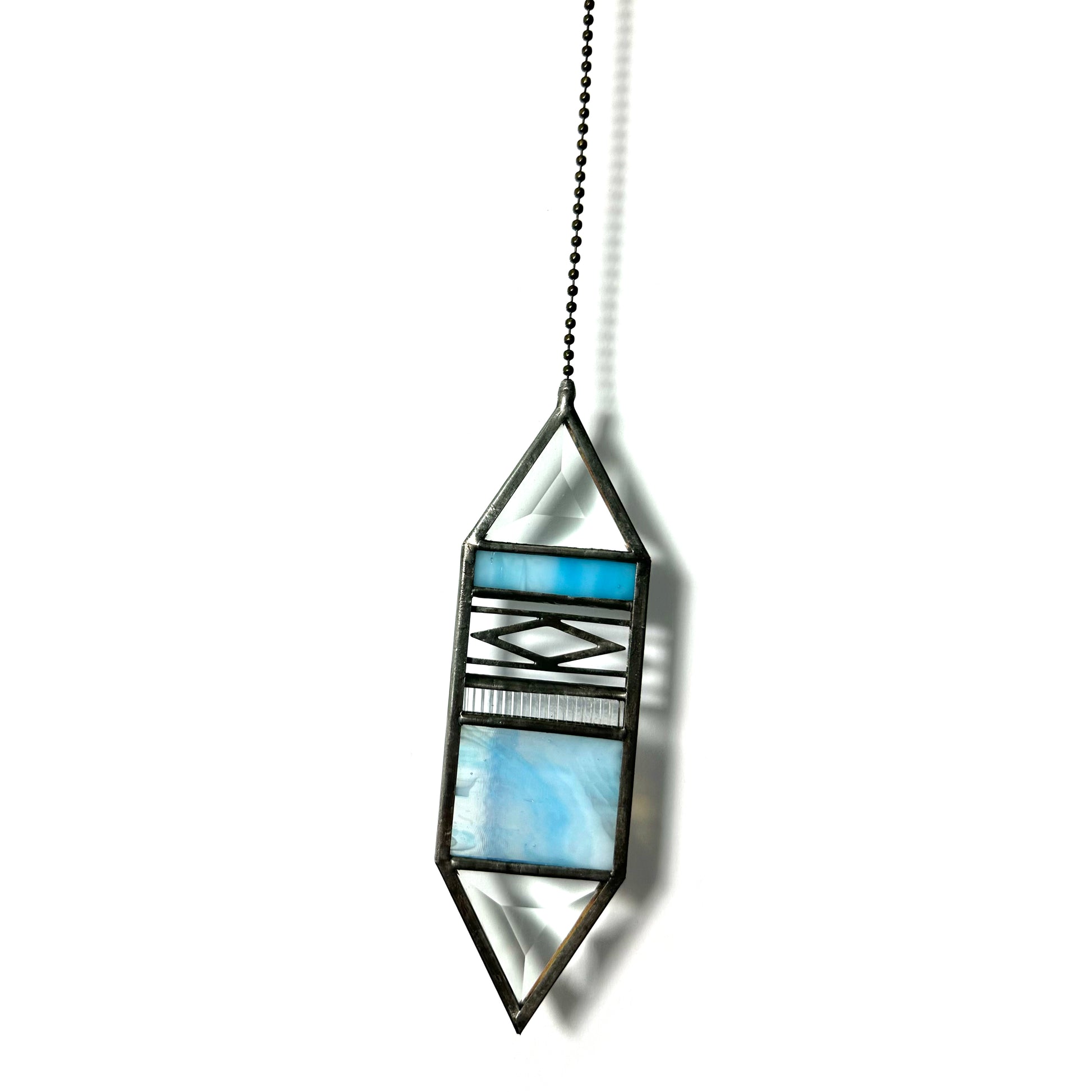Small Turquoise Trigon Suncatcher. Features handmade panels of turquoise and white glass with a unique swirled pattern.This particular glass contains many lines and bubbles, these are not cracks.