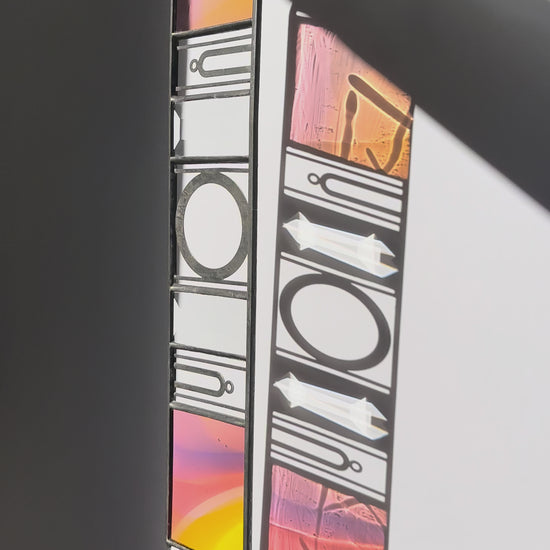 Sunset Reflection Suncatcher in transparent rainbow glass. This design features mouth blown panels of glass made by glassblowers at Fremont Antique Glass in Seattle, Washington. Each panel takes several days to produce and is entirely one of a kind. Due to the handmade nature of this glass, you may notice air bubbles, lines, or scratches.