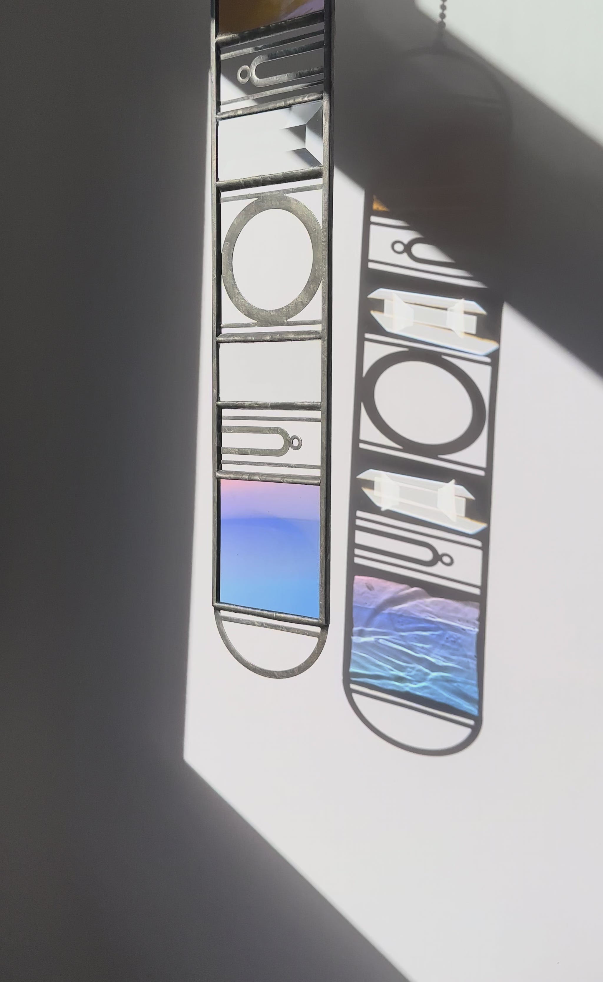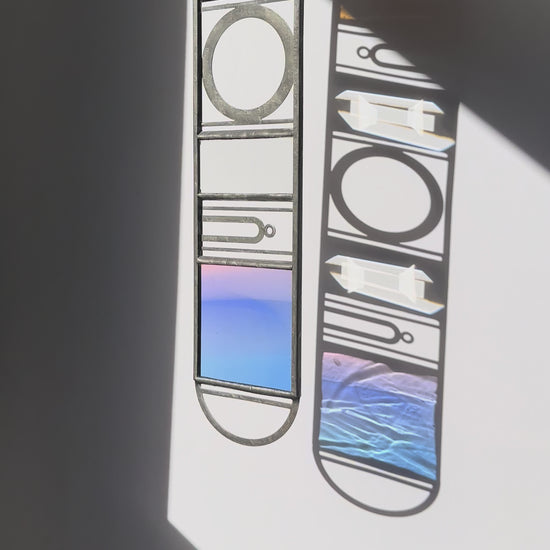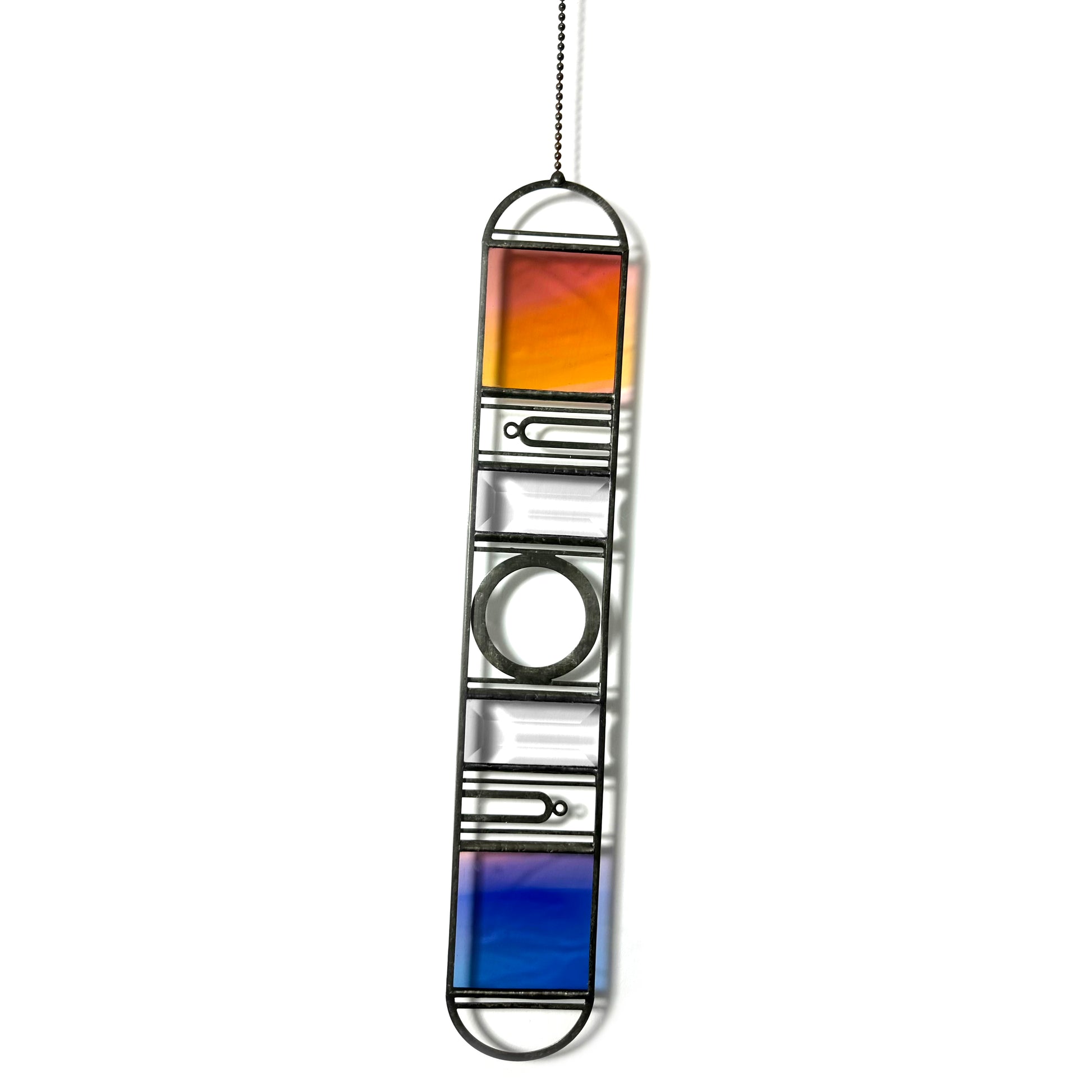 Sunset Reflection Suncatcher in transparent rainbow glass. This design features mouth blown panels of glass made by glassblowers at Fremont Antique Glass in Seattle, Washington. Each panel takes several days to produce and is entirely one of a kind. Due to the handmade nature of this glass, you may notice air bubbles, lines, or scratches.